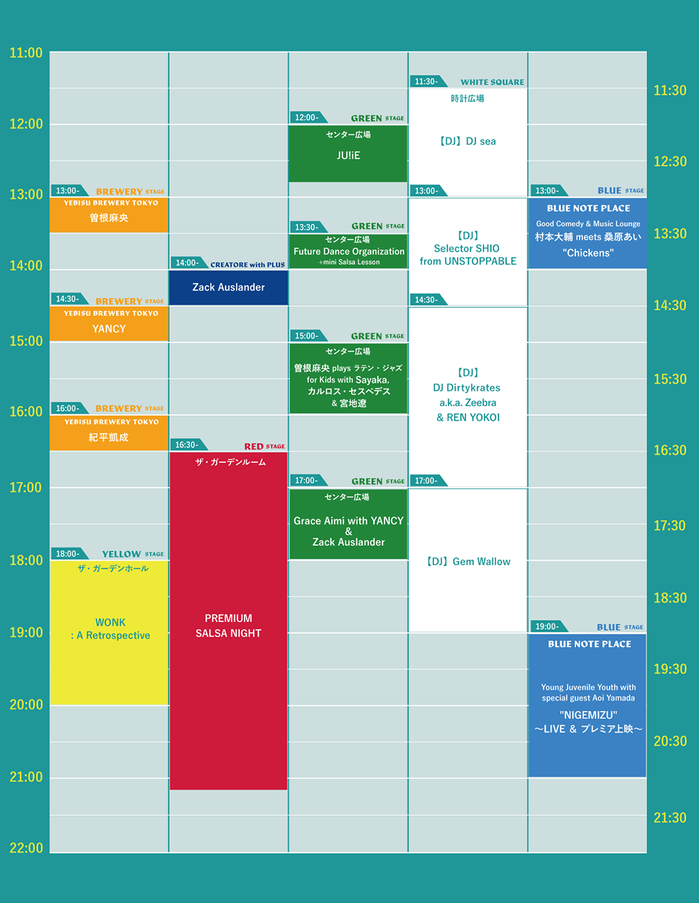 今年は、YELLOW STAGE(ザ・ガーデンホール)、RED STAGE(ザ・ガーデンルーム)、BLUE STAGE(BLUE NOTE PLACE)でのライブに加え、入場無料エリアはGREEN STAGE(センター広場)、WHITE SQUARE(時計広場)、CREATORE with PLUS、そして今年から新たにBREWERY STAGE(YEBISU BREWERY TOKYO)までエリアを拡大。