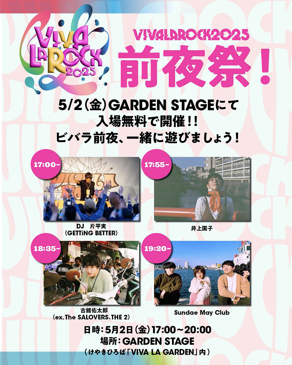 今年も開催前夜となる5⽉2⽇(⾦)に、⼊場無料のパーティー「VIVA LA ROCK 2025 前夜祭!」を開催することが決定。その出演アーティストとして、井上園⼦、Sundae May Club、古舘佑太郎(ex. The SALOVERS、THE 2)、DJ ⽚平実(GETTiNG BETTER)の4組が発表された。前夜祭は5⽉2⽇(⾦)の17時〜、GARDEN STAGEにて⾏われるので、ぜひ遊びに来てほしい。