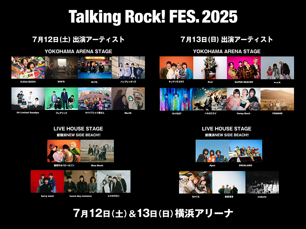 2025年7月12日(土)、13日(日)に、毎夏恒例のTalking Rock!主催イベント『Talking Rock! FES.2025』が、今年も横浜アリーナと新横浜NEW SIDE BEACH!!の2ステージ制にて開催される。