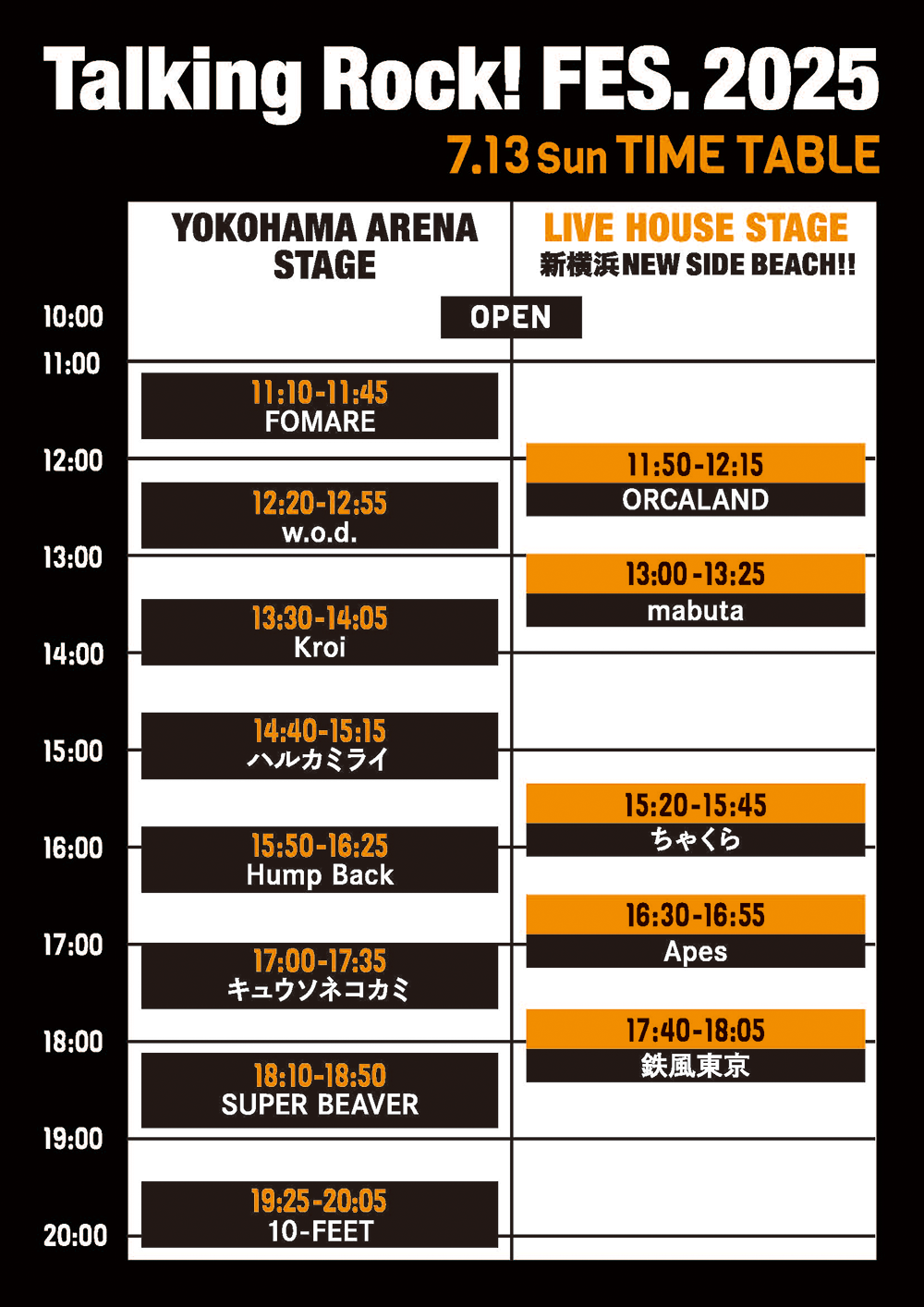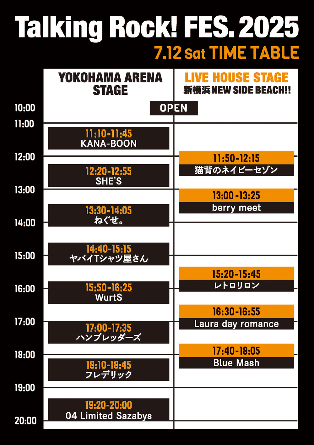 7月12日(土)&13日(日)に横浜アリーナで開催する音楽雑誌「Talking Rock!」の主催イベント『Talking Rock! FES.2025』のタイムテーブルの発表です。今年も昨年と同様に“横浜アリーナステージ”と、敷地内に隣接するライブハウス・新横浜 NEW SIDE BEACH!!を使用した“ライブハウスステージ”の2ステージ制で開催。“横浜アリーナステージ”の1日目はKANA-BOONから始まり、トリは04 Limited Sazabysが。そして2日目はFOMAREでスタートし、大トリは10-FEETが務めてくれます。2ステージは2日間ともに演奏時間は被りなしで、購入された1日券でそれぞれ入退場が可能。6月7日(土)の10時からチケットの一般発売を開始します。2日間で計26組が出演する今夏の『Talking Rock! FES.2025』。みなさんぜひ横浜アリーナに足を運んでください。