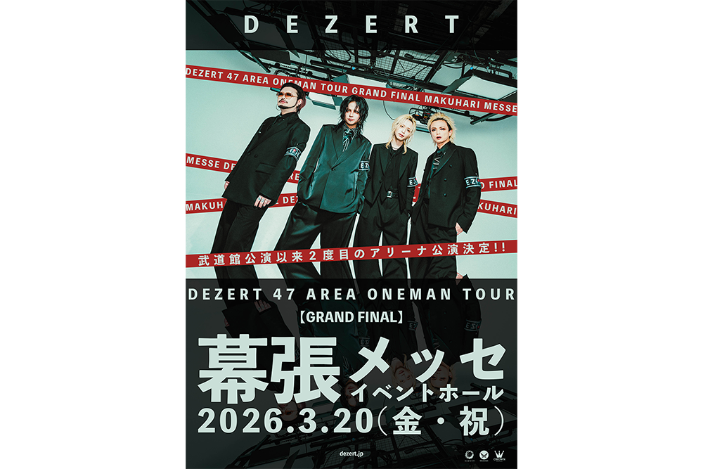 バンド史上初となる47都道府県を巡る全国ツアー「DEZERT 47 AREA ONEMAN TOUR '25-'26 "あなたに会いに行くツアー"」の初日を千葉LOOKで迎えたDEZERTが、2026年3月20日(金祝)幕張メッセイベントホールにてワンマンライブを開催することを発表した。