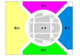 - 1314人の観客が座る円形の客席をスクリーンとステージが取り囲み、客席が360°回転することで、全方向のステージとスクリーンを見ることができる。